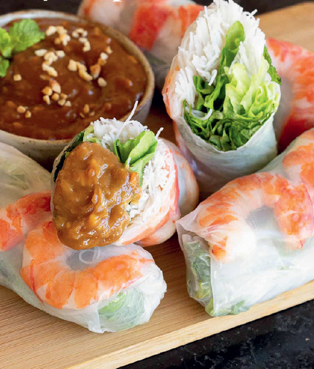 Ingredients • 200 g prawns, cooked, sliced in half lengthways (500 g if unshelled) • 200 g vermicelli rice noodles • 8 sheets rice paper wrappers • 3 leaves lettuce roughly chopped • 1 bunch fresh mint leaves • water boiling, for soaking vermicelli noodles • water lukewarm, for dipping rice paper sheets Ingredients for the Peanut hoisin sauce • 3 tbsp hoisin sauce • 2 tbsp crunchy peanut butter • 1 tsp sesame oil • 1 clove garlic finely chopped • water Method Take a rice paper wrapper and rotate it in the warm water until all surface areas have been covered. Pop it on your plate and top with lettuce, mint and vermicelli on the edge closest to you, then pop the prawns about 2-3cm closer to the top edge. Now grab the bottom of the rice paper and roll it over the greens. Tuck in both sides and continue rolling up the rest of the way. That’s it! All that’s left is to dip it in your delicious peanut hoisin sauce or nuoc mam cham and eat. Yum! Method for the Peanut hoisin sauce Add the hoisin sauce, peanut butter, sesame oil and garlic into a small saucepan and gently simmer on the stove. Stir through water a little bit at a time until the sauce has a glossy look and a smooth, slightly runny texture. Taste test a few times and add more of any ingredient or water until you’re satisfied with the flavour.