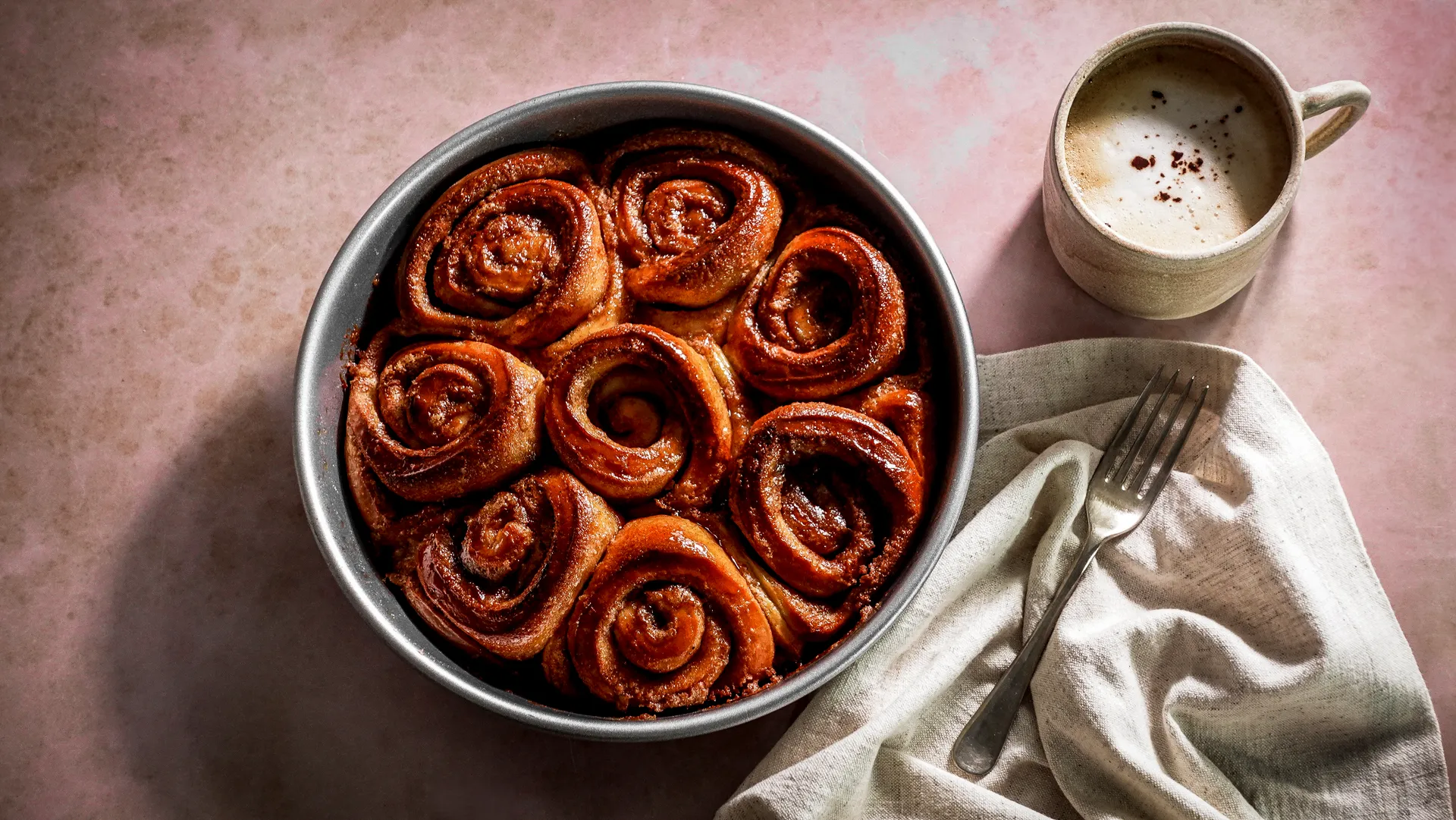 Place cinnamon rolls in a circular, greased baking tray, leaving a gap of 2cm around each bun.