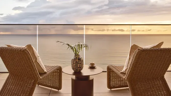 Rising above Burleigh’s iconic Norfolk pines, the twin-tower property has brought the brand’s signature design aesthetic to Queensland. Rooms are spacious and light-filled, with natural stone, warm timber and curved architectural lines echoing the surrounding landscape. Floor-to-ceiling windows frame the breathtaking ocean views, while generous balconies encourage guests to slow down and settle into the rhythm of the coast. One standout detail is the television cleverly hidden within the ottoman at the foot of the bed – stylish, discreet and surprisingly practical.